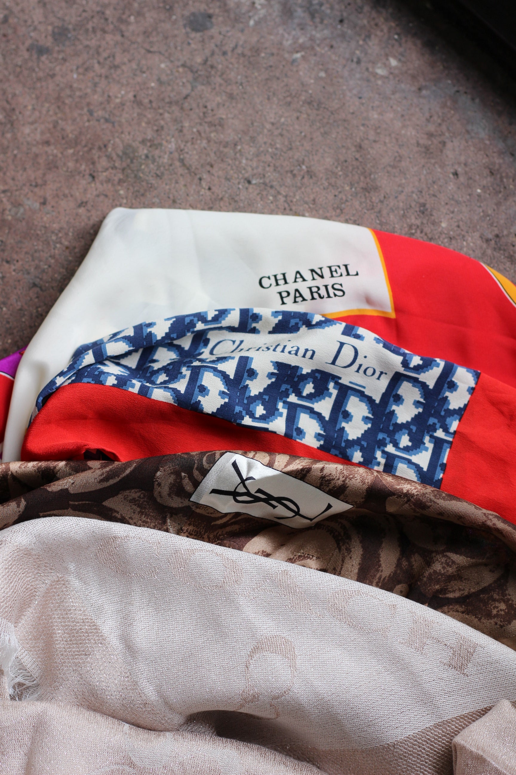 | □商品コメント | ブランド スカーフを7点セットで販売いたします。イヴ・サンローラン、ジバンシィ、ディオールなどが含まれます |